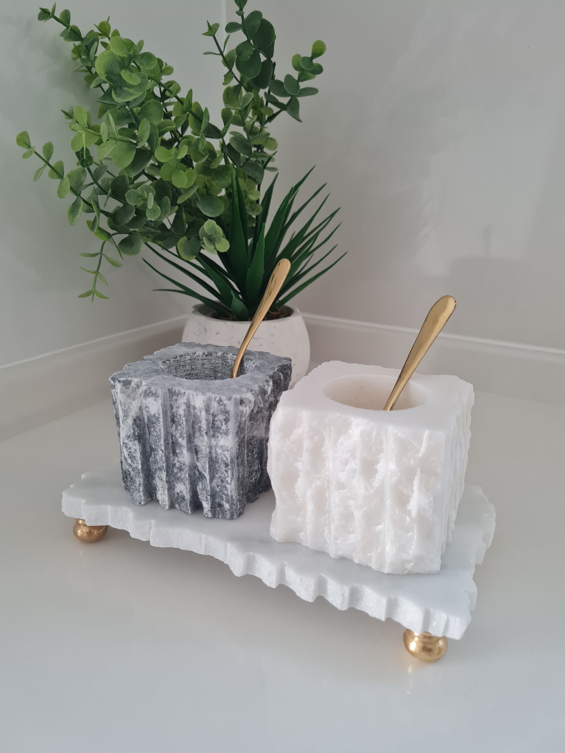 2 Marmor Gewürzbehälter mit Löffel und Tablett matt